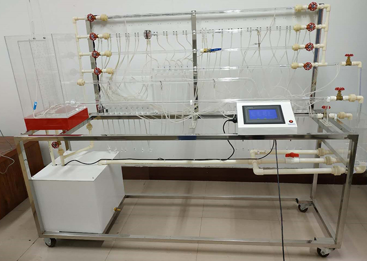 移動式不銹鋼實驗臺、儲水箱;雷諾測試管;伯努利測試管;沿程阻力系數(shù)測試管;突擴、突縮測試管;閥門局部阻力系數(shù)測試管;孔板流量計測試管;文丘里流量計測試管;和皮托管測試管;測壓板直接顯示總水頭線和測壓管水頭線;壓力傳感器24套、流量傳感器4套、溫度傳感器1套、觸摸屏、測壓板。