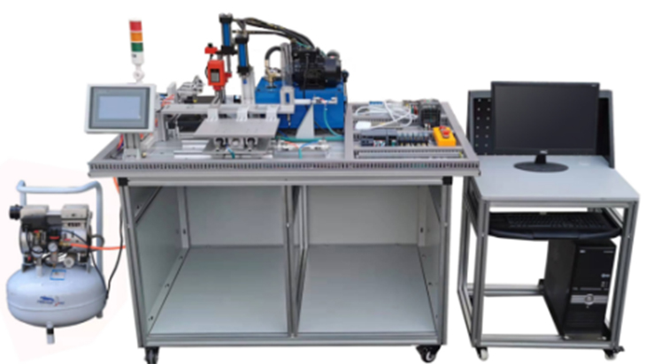 機(jī)電液氣一體化綜合實(shí)訓(xùn)考核裝置的實(shí)訓(xùn)工作臺(tái)為鋁合金型材組合而成,臺(tái)面上安裝有上料、傳送、沖壓加工、夾緊、鉆孔加工、分揀、入料槽等,并配有液壓系統(tǒng)、氣壓系統(tǒng)、變頻器及繼電器控制、PLC等
