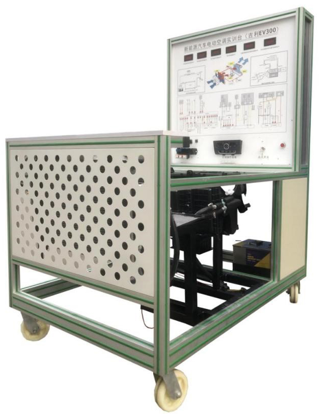 點火開關、電動汽車空調(diào)壓縮機、膨脹閥總成、干燥器總成、鼓風機總成、冷凝器、冷卻電子風扇、電動空調(diào)壓縮機控制器總成、空調(diào)蒸發(fā)箱總成、充電器與充電接口、充電插線、DC-DC轉換器、鋰電池組、空調(diào)操作面板、高低壓空調(diào)壓力表、采暖模塊總成、電源總開關、急停開關、直流接觸器、輔助蓄電池(12V45AH)、一體化全鋁合金型材搭建的移動臺架(1500×1000×1700mm ,帶自鎖腳輪裝置,帶安裝檢測端子的原理面板948×898mm)、故障模擬與排除裝置、設備操作說明書。