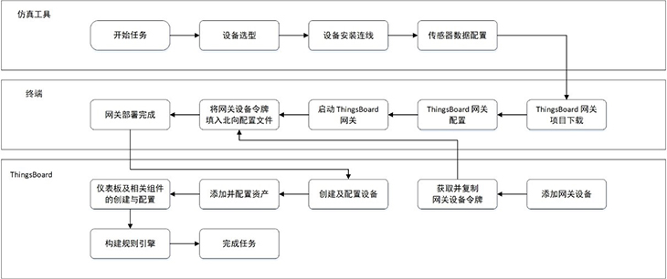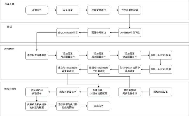 模擬智慧牧場系統(tǒng)還引入使用開源軟件平臺(tái)ChirpStack與ThingsBoard,結(jié)合LPWAN技術(shù),實(shí)現(xiàn)遠(yuǎn)程低功耗數(shù)據(jù)采集、上報(bào)和展示。在ChirpStack平臺(tái)上,用戶可對(duì)網(wǎng)關(guān)、GPS、溫濕度傳感器等設(shè)備進(jìn)行配置,以上送仿真實(shí)驗(yàn)中的虛擬數(shù)據(jù)。在ThingsBoard平臺(tái)上,設(shè)置牧場地圖、告警信息、溫濕度等各儀表盤組件;獲取仿真設(shè)備上送的數(shù)據(jù),并將數(shù)據(jù)以圖表形式作可視化呈現(xiàn);以及基于流式編程添加相應(yīng)的規(guī)則策略,最終完成模擬智慧牧場實(shí)訓(xùn)場景的部署搭建。