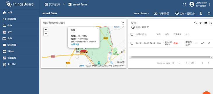 圖:智慧牧場課程案例,使用GPS對(duì)奶牛位置進(jìn)行定位,通過LoRa網(wǎng)絡(luò)將位置信息上報(bào),使用ThingsBoard平臺(tái)的電子圍欄工具結(jié)合騰訊地圖,實(shí)現(xiàn)奶牛越過電子圍欄時(shí)發(fā)送警報(bào)提醒。