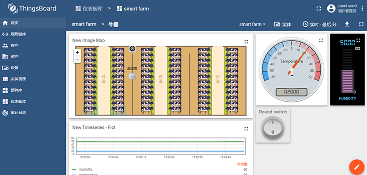 圖:智慧牧場課程案例,在牛棚內(nèi)安裝溫濕度傳感器和排風(fēng)扇,在ThingsBoard云平臺(tái)上制定規(guī)則策略,當(dāng)棚內(nèi)溫度過高時(shí)自動(dòng)開啟排風(fēng)扇對(duì)牛棚進(jìn)行降溫,以保障奶牛養(yǎng)殖環(huán)境處在適宜的溫度下。