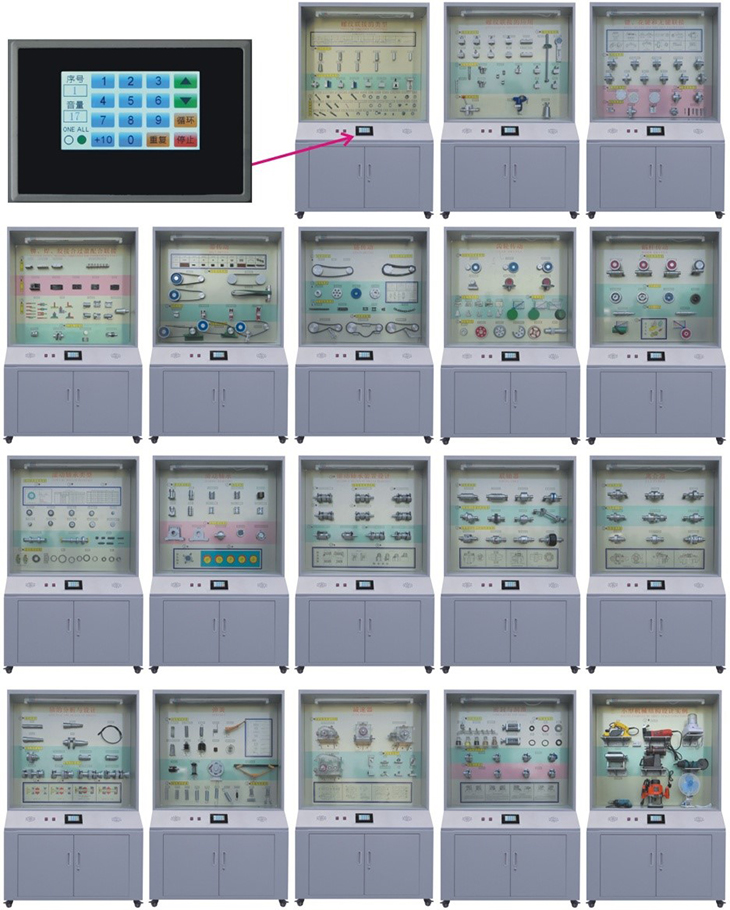 機械設(shè)計零件陳列柜,是根據(jù)機械設(shè)計(零件)課程基本要求設(shè)計制造的實驗設(shè)備。陳列柜通過機械零件模型或?qū)嵨铮浜舷鄳?yīng)的圖文資料,形象地展示與解說機械設(shè)計的基本知識,加強學(xué)生對通用機械零件的類型、結(jié)構(gòu)特點及其設(shè)計的感性認知,為進一步學(xué)習(xí)機械設(shè)計奠定基礎(chǔ)。