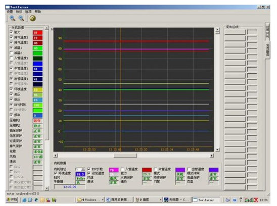 中央空調(diào)機(jī)由于工程復(fù)雜,設(shè)備分散,有的已經(jīng)裝修在開花板上測(cè)試程序,一但出現(xiàn)了故障,工程量相當(dāng)大,為了能夠快速準(zhǔn)確地測(cè)出故障是由主機(jī)機(jī)組還是室內(nèi)機(jī)的故障的,每個(gè)生產(chǎn)廠家根據(jù)生產(chǎn)的和維修的需要而開發(fā)了中央空調(diào)測(cè)試程序?蓽y(cè)試壓縮機(jī)的運(yùn)轉(zhuǎn)頻率,傳感器的各種數(shù)據(jù),電子膨脹閥的工作步數(shù)等幾十種中央空調(diào)的工作數(shù)據(jù)和狀態(tài),軟件可實(shí)現(xiàn)對(duì)內(nèi)機(jī)的控制,,可以對(duì)1-64臺(tái)內(nèi)機(jī)的狀態(tài)進(jìn)行設(shè)定。是高校提供了好的研究的學(xué)習(xí)設(shè)備。