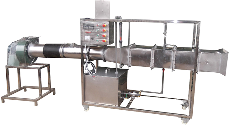 循環(huán)防腐水泵,轉(zhuǎn)子流量計、風冷冷凝器,翅片管式換熱器,風洞實驗段,多翼式低噪音離心風機,自動調(diào)節(jié)風門,笛形管及差壓測風速裝置,加熱由固體調(diào)壓模塊無級調(diào)節(jié),控制測試儀表箱,不銹鋼加熱水箱,8路萬能信號輸入巡檢儀顯示溫度、水和風的阻力及風速。