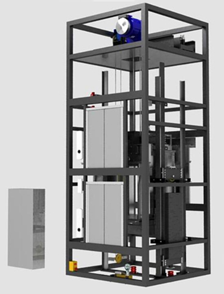 電梯機(jī)房實(shí)訓(xùn)裝置,模擬機(jī)房教學(xué)電梯(三層三站)包括架體,控制柜和電源柜,架體為雙層框架結(jié)構(gòu),架體上設(shè)置一個曳引機(jī)機(jī)座,曳引機(jī)機(jī)座上固定一個曳引機(jī),曳引機(jī)一側(cè)的架體上固定一個限速器,限速器上方設(shè)置一個盤車手輪和松閘扳手,盤車手輪和松閘扳手固定在墻體上,曳引機(jī)的對重從下方架體的兩個槽孔中穿過,限速器的對重也從下方架體的槽孔中穿過.本實(shí)用新型安裝于較大的空間內(nèi),結(jié)構(gòu)簡單,方便安裝和操作,可完美模擬電梯機(jī)房的安裝現(xiàn)場和模擬電梯應(yīng)急救援過程,并可結(jié)合土建圖紙學(xué)習(xí)機(jī)房的現(xiàn)場勘測,使學(xué)員及教員可以更好地觀察或安裝電梯機(jī)房內(nèi)的部件結(jié)構(gòu)和運(yùn)行狀態(tài),學(xué)習(xí)電梯應(yīng)急救援過程和土建勘測,方便了電梯機(jī)房的教學(xué),印象直觀而深刻,提高了機(jī)房實(shí)訓(xùn)效果.