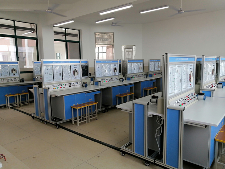 電子電工與PLC實(shí)訓(xùn)室配置有西門(mén)子公司S7-1200系列PLC作為控制核心,同時(shí)配套有流水燈、港口起重機(jī)、十字路交通燈、三層電梯、天塔之光等預(yù)設(shè)實(shí)訓(xùn)模塊。其附帶有7英寸彩色觸摸屏,通信下載編程電纜,觸摸屏與PLC通信電纜,開(kāi)發(fā)組態(tài)軟件等配套設(shè)備,構(gòu)建了完全真實(shí)的PLC項(xiàng)目開(kāi)發(fā)環(huán)境,便于學(xué)生演練PLC項(xiàng)目開(kāi)發(fā)的全套流程。同時(shí),實(shí)訓(xùn)設(shè)備外掛了電子實(shí)訓(xùn)模塊,可供學(xué)生進(jìn)行電子相關(guān)實(shí)訓(xùn)。該實(shí)訓(xùn)室利用多媒體教學(xué)、網(wǎng)絡(luò)教學(xué)等先進(jìn)手段,將復(fù)雜知識(shí)點(diǎn)簡(jiǎn)單化,將實(shí)訓(xùn)內(nèi)容與工作任務(wù)融合為一,實(shí)現(xiàn)了一體化教學(xué)的目的。
