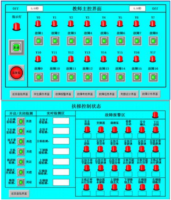 2.電氣控制采用西門子PLC系統(tǒng),驅(qū)動采用變頻節(jié)能控制;智能故障考核系統(tǒng)采用10寸真彩觸摸屏。系統(tǒng)有教師登陸和學生登陸功能,16個故障設(shè)計功能,定時排故,考題計分功能,扶梯模型配套有電氣故障點設(shè)置,學生可以通過故障現(xiàn)象在裝置上檢測、查找故障點,并將其修復。通過在該實訓裝置上的實訓訓練,使學生能夠真正學習和掌握自動扶梯的安裝維修保養(yǎng)技術(shù)及技能。具備故障反饋、故障代碼查詢。